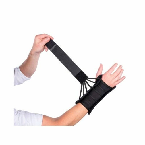 Eenvoudig aan te leggen polsbrace met een voorgevormde, aanpasbare aluminium spalk voor stabilisatie en bescherming van het polsgewricht.