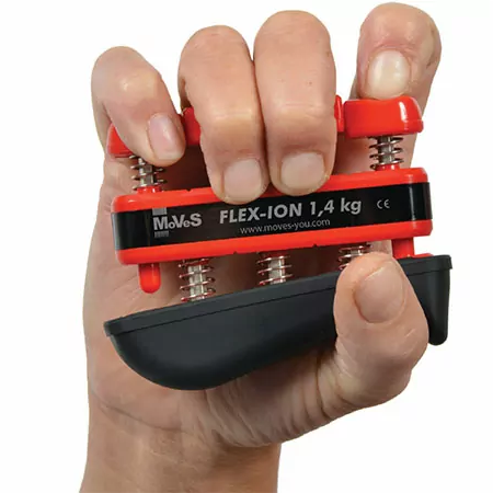 Omdat de veerbelaste knoppen van de MoVeS Flex-Ion elk cijfer isoleren, kunnen de sterke vingers de zwakkere niet compenseren. Als resultaat biedt de MoVeS Flex-Ion een beter, sneller en gemakkelijker te controleren revalidatieproces. MoVeS Flex-Ion is verkrijgbaar in 6 verschillende handweerstanden. Deze geleidelijke weerstand helpt de therapeut de voortgang te meten. Bovendien voegt de ergonomische basis comfort en stabiliteit toe.
