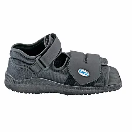 De MedSurg Schoen, met zijn bekende semi-rigide zool, is gebouwd rond het gepatenteerde MetaShank™-systeem, wat de voorvoet ontlast en steun geeft en een meer rigide en beter beschermde voorvoet garandeerd, na bijvoorbeeld postoperatief bij osteotomieën. De ademende net-bovenvoering past zich aan aan bot-afwijkingen van de voet en heeft een versterkt hieldeel en een gevoerde hielrand om de achtervoet te stabiliseren en wegglijden te voorkomen. De extralange banden zijn geschikt voor zelfs de dikste verbanden.